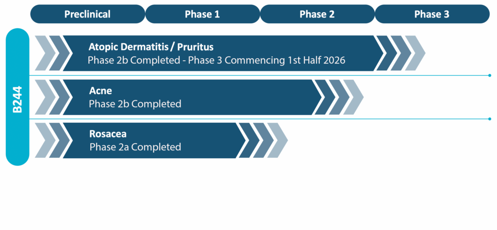 We have completed six Phase 2 clinical programs and multiple pre-clinical programs. Over 1,700 patients have been enrolled in our clinical trials since 2016. Regardless of dose, mode of delivery, indication targeted, or age of patients, our bacterial drug candidate B244 has been very well tolerated with an adverse event profile that is equal to or less than the vehicle, which is essentially saltwater (PBS buffer).